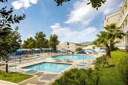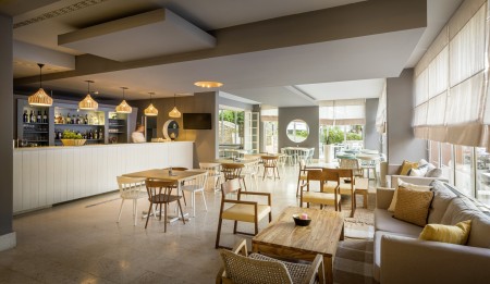 The hotel has renovated its rooms for the 2024 season and is located on a hillside, a ten-minute walk from the town center. It consists of a main building and the adjacent residence.