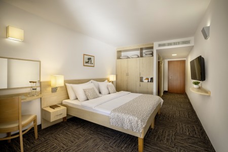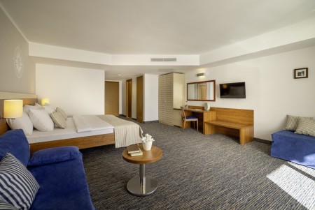 Facilities: Restaurant with terrace, café-bar with terrace in the inner courtyard, TV room, conference and seminar room, souvenir and magazine store, bistro snack bar. Freshwater swimming pool complex with relaxation pool, separate children's pool and pool for activities and water games, lounge bar by the pool, parasols and sun loungers (free of charge, limited number). Daytime entertainment program with sports activities (01.07.-31.08.), occasional dance music in the evening, children's playground, Maro Club for children of different ages. Storage room for bicycles and washing area as well as unguarded car parking nearby. WiFi internet available throughout the hotel (free of charge).