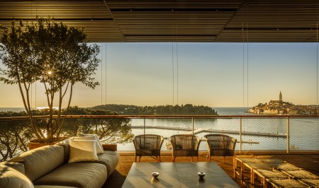 Grand Sea View room: approx. 63-70 m ², bedroom with double bed, living room with lounge area, bathroom and separate toilet, two Smart TVs, large balcony with sun loungers and a view of the sea and the old town of Rovinj. Additional services - daily bottle of still water 0.75 l, fruit, juice and a sweet tart on arrival. Goodnight turndown gift.