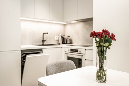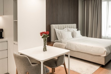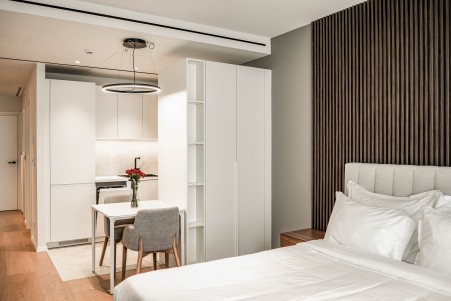 Studio Deluxe: approx. 32-34 m², with double bed (160x200 cm) and fully equipped kitchen (fridge, dishwasher, oven and hobs, coffee machine), small dining area, air conditioning, smart satellite TV, safe, washing machine/dryer, WiFi internet (free of charge) and shower/WC. Baby crib available free of charge on request.