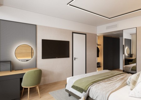Double room Premium: approx. 23-25 m², with double bed and pull-out armchair (90x200 cm), balcony facing the sea.
