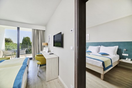 Premium family room: approx. 27 m², double bed, two sofa beds (90x200 cm each), balcony facing the sea.