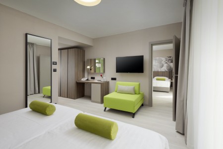 198 rooms in the Residence: modernly furnished with air conditioning, satellite TV, telephone, WiFi Internet (free of charge), minibar (for a fee), safe, shower/WC and balcony. Baby crib available free of charge on request.