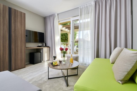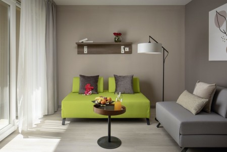 Family room: approx. 47 m², double room and living room with sofa bed for two children. Optionally bookable on the park or pool side.