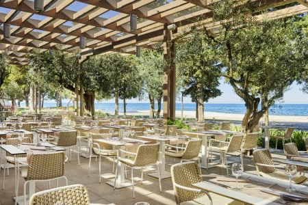 Beach: The rocky beach with sunbathing areas and partly sandy seabed, showers, beach bar, sun loungers and parasols (free of charge, limited number) is 30-100 m away through the park.
