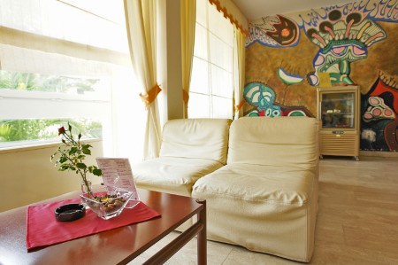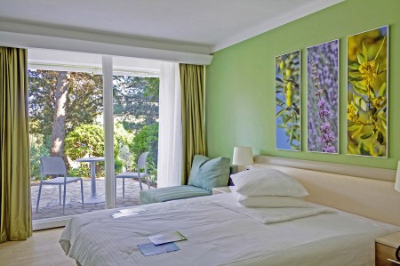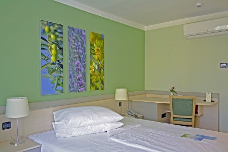 Rooms in the main building: approx. 20 m², with minibar, satellite TV, air conditioning, telephone, WiFi internet (free), shower/WC and balcony. Optionally bookable facing the sea and with an extra bed for a child up to 11.99 years. Baby crib available on request (for a fee, €10 per day)