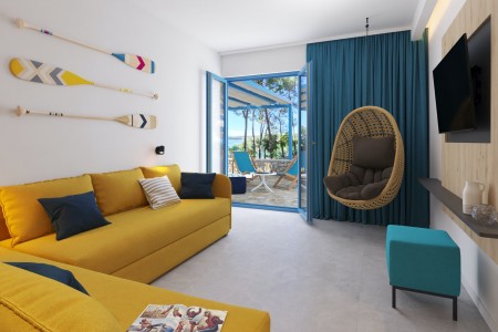 Junior Suite: approx. 42 m², double bed, living area with additional sofa bed for two people, terrace or balcony facing the sea.