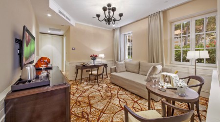 Alhambra Suite: approx. 50 m², one double room, separate living room with couch, bathroom with bathtub, shower and WC, sea view, some with balcony.