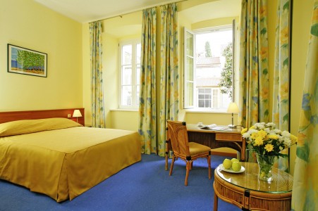 25 rooms: approx. 20 m², comfortably furnished, with air conditioning, satellite TV, WiFi internet (free of charge), minibar, safe, bath or shower/WC. Optionally bookable with sea view. Baby crib available on request for a fee (€ 15 per night). Loft rooms are located on the top floor with a sloping roof.