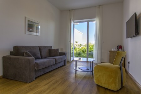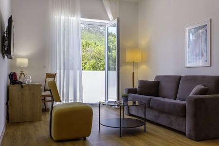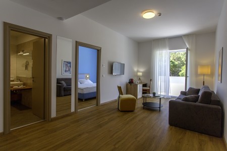 Junior Suite: approx. 47 m², bedroom with double bed, living room/bedroom with sofa bed (200 x 160 cm) for a further 2 people, terrace or balcony with sea or garden view.