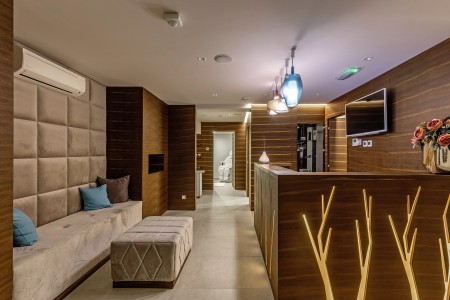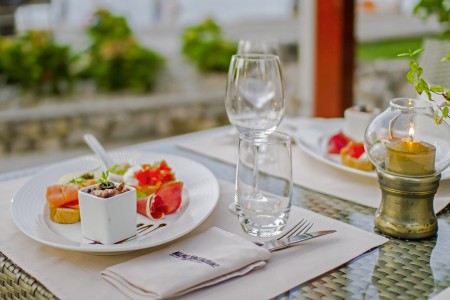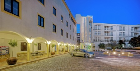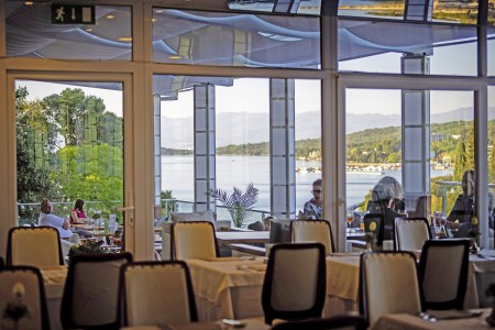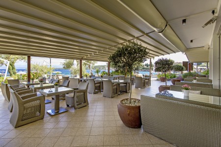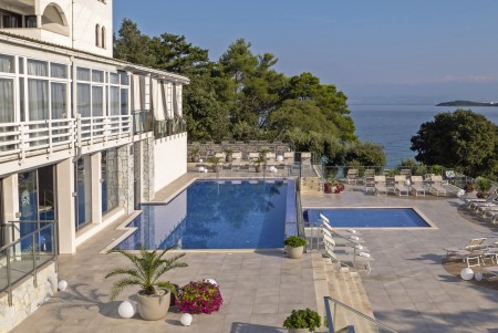 The small hotel complex, consisting of three interconnected buildings, is situated on a hill overlooking the sea, surrounded by greenery. The hotel has been extensively renovated in recent years.