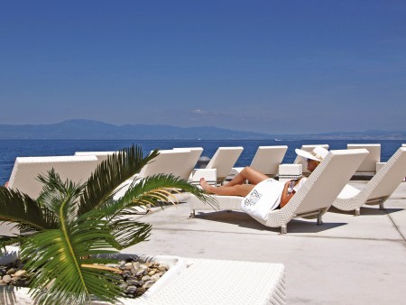 Family suite: approx. 35-40 m², on the first floor, elegantly and luxuriously furnished, bedroom with double bed, living area with sofa bed (140x200 cm), kettle, wine fridge and access to the sea-facing terrace with four chairs, table and two sun loungers.