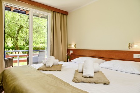 Double room: approx. 16 m², double bed or two separate beds (2x 190x80 cm), bathroom with shower/WC, WiFi internet (free of charge), satellite TV and air conditioning. Balcony with park view. Free parking at the bungalow for one car.