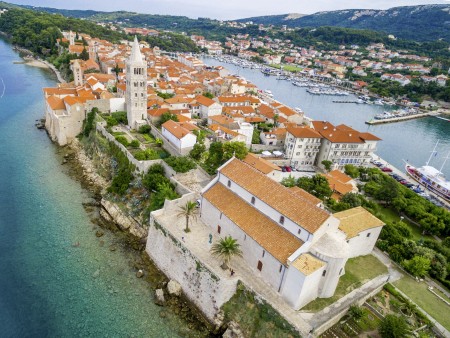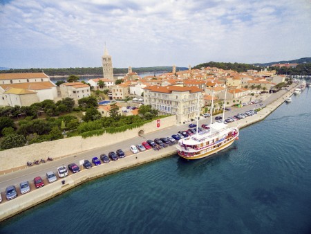 Rab, the capital of the island of the same name, is situated on the narrow peninsula in the south western part of the island. It is characterised by the medieval townscape with its narrow alleys and its typical bell towers. For the development of tourism the pleasant climate is important, as well as the clear sea, many cultural and historical monuments, beautiful nature and also the hospitality of the local population. This island is connected by ferries and speedboats with the mainland (port of Jablanac) and with the island of Krk.Rab offers many sport possibilities for guests who love active holidays: diving, water skiing, windsurfing, canoeing, boat rental, parasailing, jet ski, tennis, beach volleyball, mini golf, bocce (boules), basketball, cycling, walking and many more.