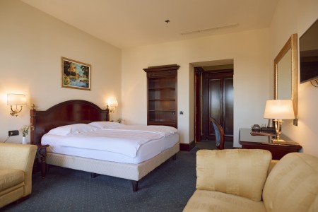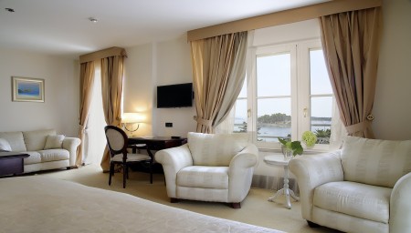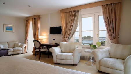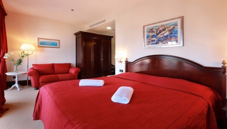 Deluxe suite: approx. 38-42 m², bedroom with king-size bed (180 x 200 cm), spacious living room with sofa bed for one person (140 x 180 cm), balcony with sea view.