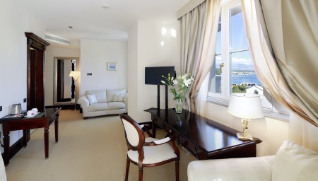 Presidential Suite: approx. 60 m², on the third floor, bedroom with king-size bed (180 x 200 cm), spacious living room with office and sofa bed for one person (140 x 180 cm), balcony with sea view.