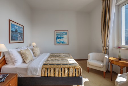 Suite: approx. 40 m², with double bed, separate living area and marble bathroom.