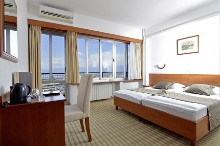 Standard room: approx. 15 m², facing the sea, mostly with balcony and view over Rijeka and the Kvarner Bay.