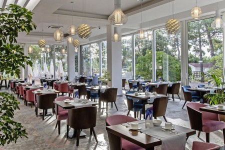 Beach: The complex is surrounded by a 4 km long sandy, pebble and rocky beach with sunbathing areas, beach and snack bars. Sun loungers and parasols for a fee.
