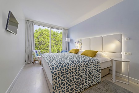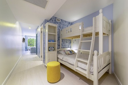 Family room: approx. 31 m², one double bed or two single beds and additional bunk bed for two children up to 11.99 years. Optionally bookable with French balcony facing the atrium, with French balcony facing the garden or with balcony with garden view.