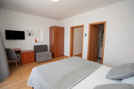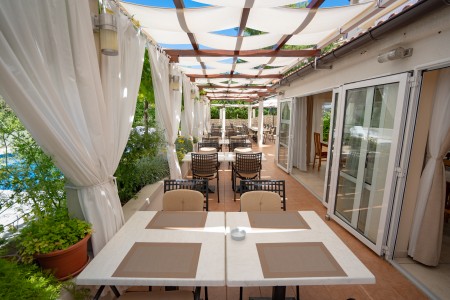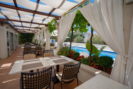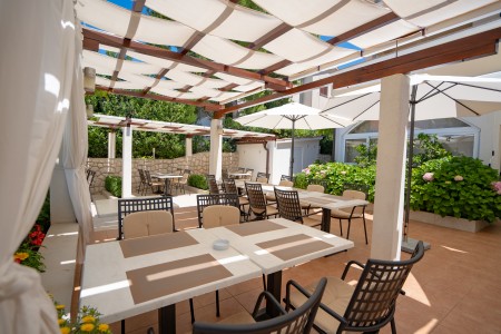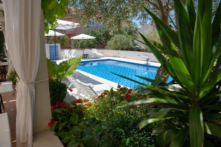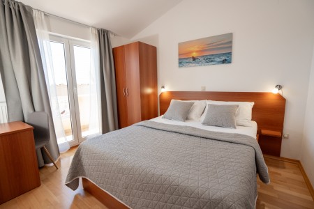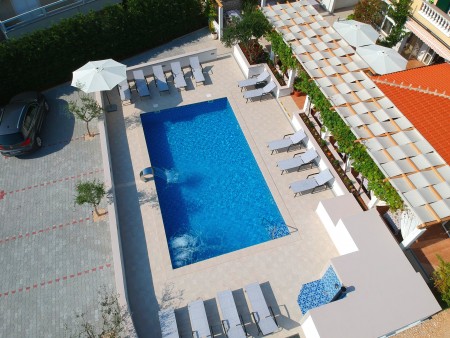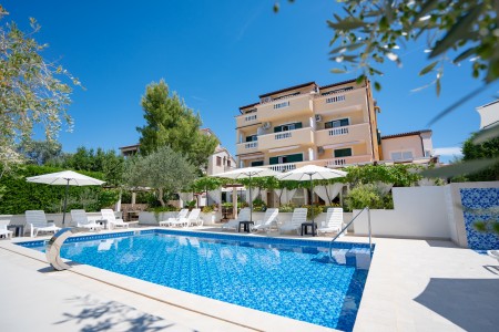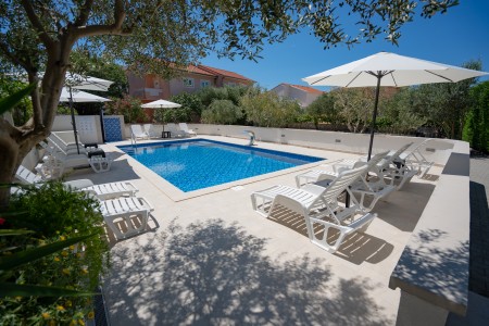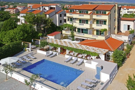 The guesthouse is located in the popular resort of Novalja on the island of Pag and offers accommodation in 12 modern and comfortably furnished rooms. The nearest pebble beach is only about 500 m away. The famous party beach Zrće, also known as the "Croatian Ibiza", is 3.5 km away. There are five clubs here from mid-June to early September, where the party goes on around the clock and top European DJs are often guests. A wakeboard facility rounds off the offer. In the early and late season, Novalja is pleasantly quiet, so that families with small children and those seeking relaxation can also enjoy a carefree time by the sea. There are numerous sandy beaches and bays with crystal-clear water just 2 kilometers from the guesthouse. The guesthouse also has a swimming pool (9 x 5 m) with a sun terrace, which is available to guests of the house for communal use.
