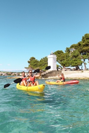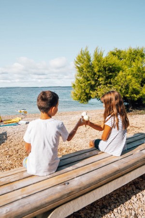 Beach: It is only 20 to 50 m to the well-kept rocky and pebble beaches, which are sheltered from the wind and have a children's playground, showers and sun loungers (for a fee). Beach bar "Bura" and restaurant "Kantun" open from mid-June to early September. A small sandy bay is located in the immediate vicinity.