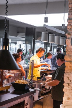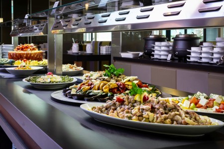 Catering: Breakfast buffet. Half board with dinner or full board with lunch and dinner bookable for an additional charge. All meals buffet style with show cooking.