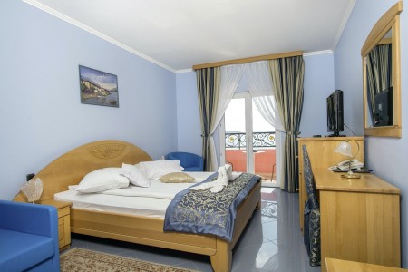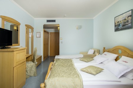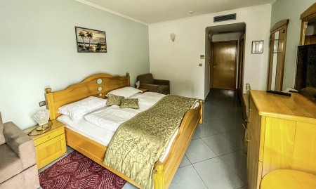 61 rooms: approx. 28-32 m², elegantly and comfortably furnished with air conditioning, telephone, WiFi Internet (free of charge), LCD satellite TV, safe, hairdryer, minibar, shower/WC and balcony. Crib available on request (for a fee, € 12 per day). Optionally bookable on the park side with 2 sofa beds (each 180x90 xm) or on the sea side with 1 sofa bed (180x90 xm).