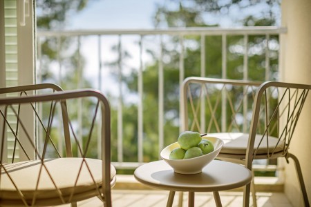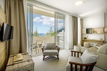 Junior Suite: approx. 32 m², one bedroom with double bed, separate living room with pull-out couch for two people (170 x 96 cm), one bathroom, balcony, facing the sea.
