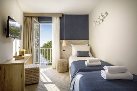 Superior double room with extra bed: approx. 17 m², two single beds or one double bed, also bookable. one double bed, also bookable with extra bed, balcony facing the sea.