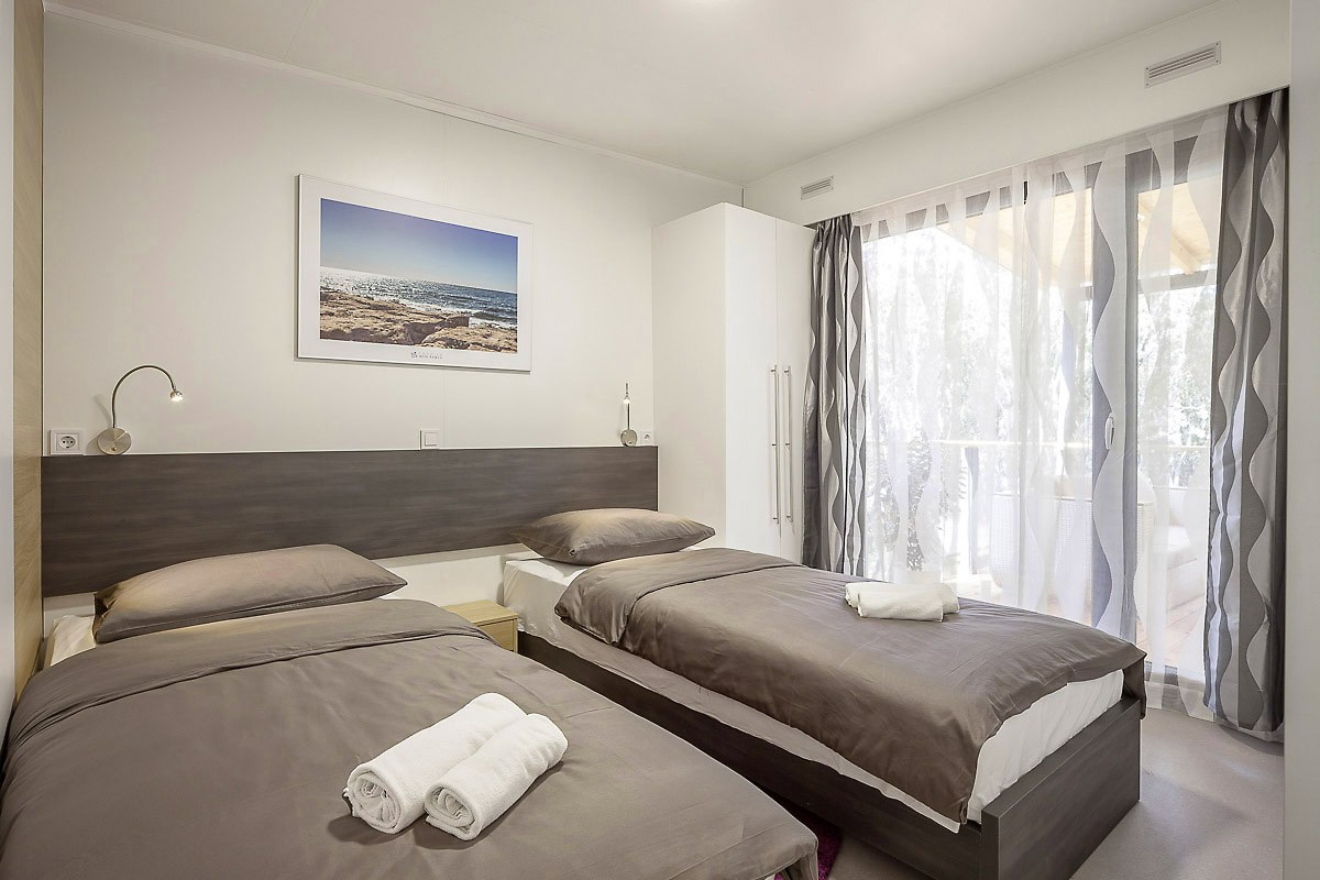 Mobile home "Beach Villa" for 4-6 persons: approx. 50 m², modern and very comfortably furnished, located in the 1st row to the sea. One bedroom with double bed (180x220 cm), one bedroom with two single beds (90x220 cm each), two bathrooms with shower/WC, spacious living room with kitchenette (combi stove with 4 hobs, fridge with freezer compartment, microwave, kettle, toaster and coffee machine), bar with four bar stools and pull-out couch for two people. Covered terrace (approx. 30 m²) with seating set and two sun loungers. Also WiFi Internet (free of charge), air conditioning and SAT-TV. Free parking for 1 car.