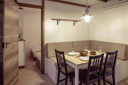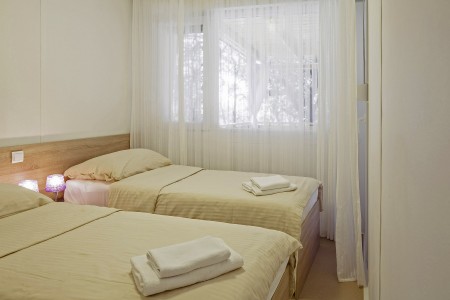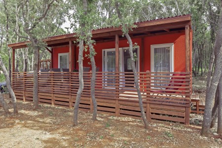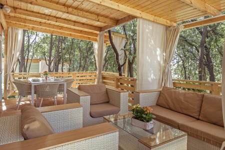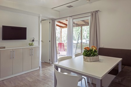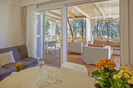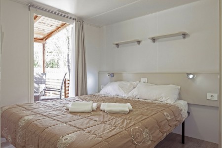 Mobile home "Deluxe" for 4-6 persons: approx. 32 m², one double room with double bed (160x200 cm), one double room with two single beds (90x200 cm each), two bathrooms with shower/WC, living room with kitchenette (combi stove with 4 hotplates, fridge with freezer compartment, microwave, kettle, toaster and coffee machine) and dining area with pull-out sofa (130x190 cm). Covered terrace (approx. 24 m²) with seating set and two sun loungers. Also WiFi Internet (free of charge), air conditioning and SAT-TV. Free parking for 1 car.