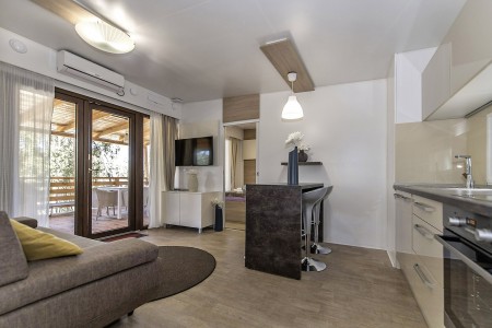 Mobile home "Villa Prestige" for 4-6 people: approx. 42 m², modern and comfortably furnished, one double room with double bed (160x200 cm), one double room with two single beds (80x200 cm each), two bathrooms with shower/WC, washing machine, spacious living room with kitchenette (combi stove with 4 hobs, fridge with freezer compartment, microwave, kettle, toaster and coffee machine), bar with four bar stools and pull-out couch for two people. Covered terrace (approx. 25 m²) with seating set and two sun loungers. Also WiFi Internet (free of charge), air conditioning and SAT-TV. Free parking for 1 car.