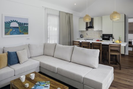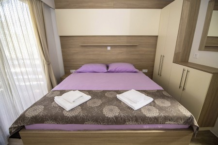 Mobile home "Beach Villa" for 4-6 persons: approx. 50 m², modern and very comfortably furnished, located in the 1st row to the sea. One double room with double bed (180x220 cm), one double room with two single beds (90x220 cm each), two bathrooms with shower/WC, spacious living room with kitchenette (combi stove with 4 hotplates, fridge with freezer compartment, microwave, kettle, toaster and coffee machine), counter with four bar stools and pull-out couch for two people. Covered terrace (approx. 30 m²) with seating set and two sun loungers. Also WiFi Internet (free of charge), air conditioning and SAT-TV. Free parking for 1 car.