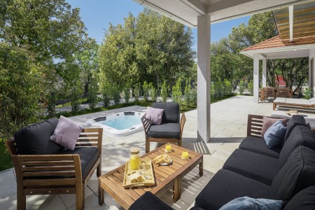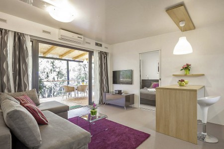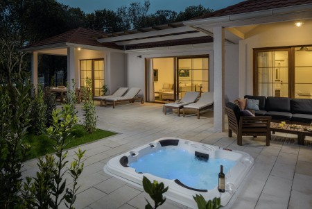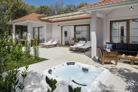 Mobile home "Bay Jacuzzi Porto Bus" for 4-5 people: approx. 67 m², luxurious and spacious mobile home in the immediate vicinity of Porto Bus Bay and the Porto Bus swimming pool complex (free entry) with panoramic views of the sea. One bedroom with double bed (200 x 220 cm), one bedroom with two single beds (100 x 220 cm each), two bathrooms with shower/WC and large washbasin, spacious dining and living area with fully equipped kitchen (electric hob, oven, fridge with freezer compartment, dishwasher, microwave, kettle, toaster and coffee machine), bar with four bar stools, pull-out couch. Washing machine, tumble dryer, yoga mat and Pilates ball. Partly covered terrace (approx. 75 m²) with seating, sun loungers and heated Jacuzzi. Also WiFi internet (free of charge), air conditioning, safe and satellite TV with Netflix in the living area. Welcome pack on arrival and organic vegetables and fruit grown locally twice a week (from approx. mid-May to mid-September). Baby crib and barbecue available on request. Parking for 1 car with e-car charging station (free of charge). Free use of a private electric vehicle during your stay.