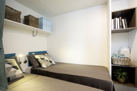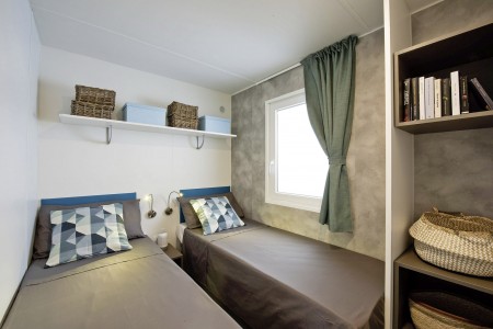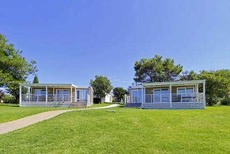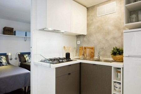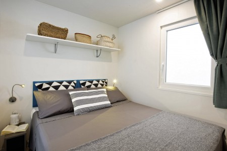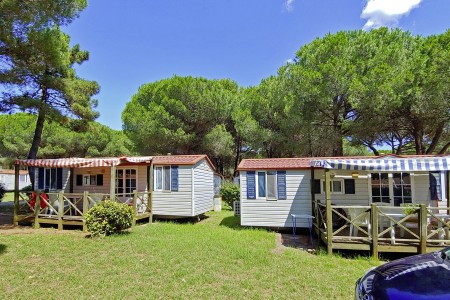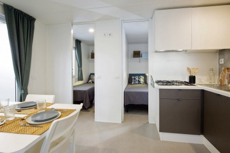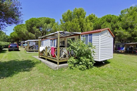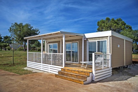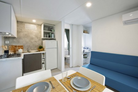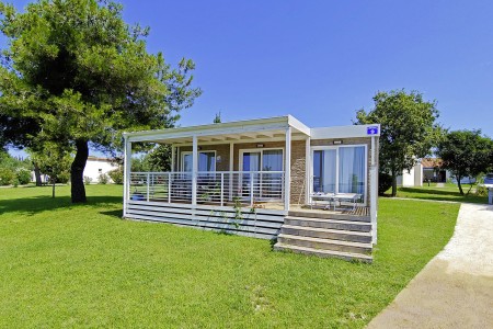 Mobile home "Premium" for 4-5 people: approx. 35 m², living room with kitchenette (gas stove, fridge, microwave), satellite TV and pull-out seating/dining area, one bedroom with double bed, one bedroom with two single beds and a bunk bed. Two bathrooms with shower/WC, covered terrace. Air conditioning (included in the price). Baby crib available free of charge on request. Parking lot at the mobile home.