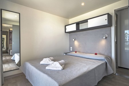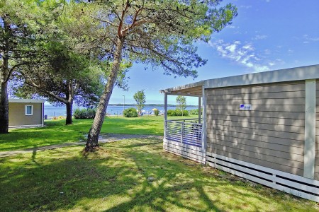 Mobile home "Deluxe Sea View" for 4 people: approx. 42 m², first row with sea view. Living room with kitchenette (gas stove, fridge, microwave), satellite TV and pull-out seating/dining area, one bedroom with double bed, one bedroom with two single beds. Two bathrooms with shower/WC, covered terrace. Air conditioning (included in the price). Baby crib available free of charge on request. Parking approx. 20-40 meters from the mobile home.