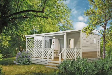 Mobile home "Comfort" for 6 people: approx. 32 m², living room with fully equipped kitchenette (gas stove, fridge with freezer compartment, microwave), satellite TV and sitting/dining area, one bedroom with double bed, two bedrooms each with two single beds, two bathrooms with shower/WC. Spacious and covered terrace with seating area. Air conditioning (20 hours included in the price). Parking space near the mobile home.
