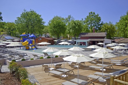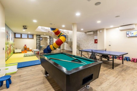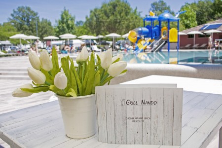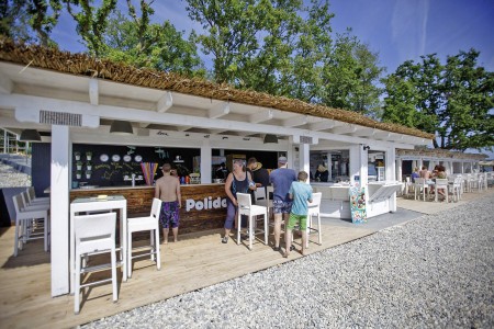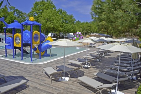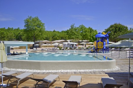 Facilities: Reception, safe at reception, restaurant, bread roll service, lounge, children's playground, multi-purpose building with modern sanitary facilities, children's playroom with large slide, games room for adults with billiards and table soccer, small fitness room, massage and beauty studio, laundry. Heated freshwater swimming pool with separate children's pool, water slide and pool bar. Free parking is available near the mobile homes and glamping tents. WiFi internet is available free of charge throughout the campsite.
