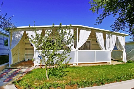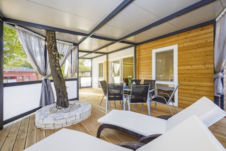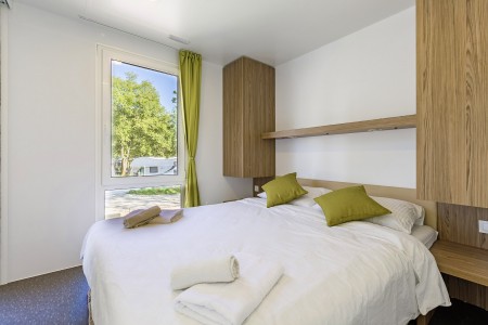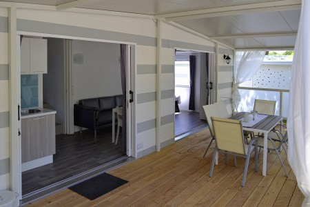 Mobile home Comfort for 4-6 people: approx. 32 m², living room with kitchenette (stove, sink, microwave, coffee machine), dining table and sleeping accommodation (130 x 190 cm) for two people, one bedroom with double bed (160 x 200 cm), one bedroom with two single beds (80 x 200 cm each), two bathrooms with shower and WC as well as a large covered terrace with seating for six people and two sun loungers. Also WiFi Internet (free of charge), safe, satellite TV and air conditioning.