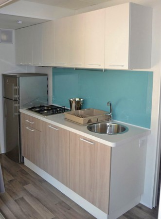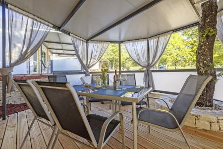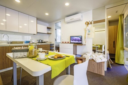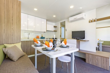 Mobile home Premium for 4-5 people: approx. 33 m², modern furnishings, living room with kitchenette (stove, sink, microwave, coffee machine), sofa and dining table, one bedroom with double bed, one bedroom with bunk bed and single bed, two bathrooms with shower and WC as well as a large covered terrace with seating for six people and two sun loungers. Also WiFi internet (free of charge), safe, satellite TV and air conditioning.