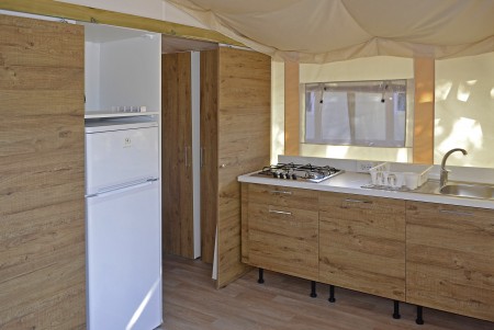 Glamping tent for 4-5 people: approx. 30 m², modernly furnished with natural materials, entrance hall, open kitchen-living room with stove, sink and pull-out sofa, one bedroom with double bed, one children's bedroom with bunk bed and single bed, bathroom with shower and WC, terrace with seating area. Also WiFi Internet (free of charge) and SAT-TV.