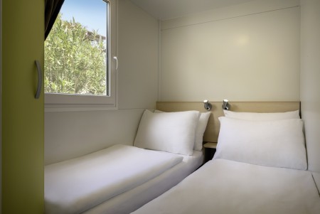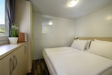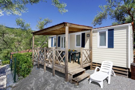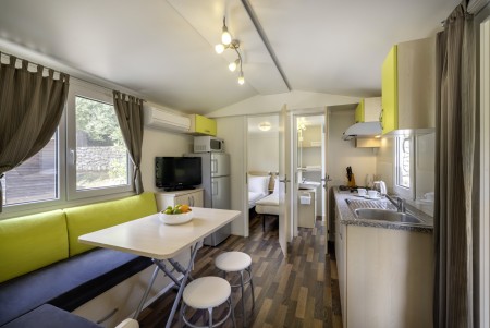 Mobile home "Marina" for 4 people: approx. 32 m², one bedroom with double bed, one bedroom with two single beds (80x200 cm), two bathrooms with shower/WC, living/bedroom with sitting area and sleeping accommodation for 2 children up to 11.99 years, dining table and fully equipped kitchenette with stove, microwave, fridge with freezer compartment and coffee machine. Covered terrace with seating set and two sun loungers. Also WiFi Internet (free of charge), SAT-TV and air conditioning.