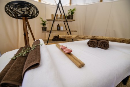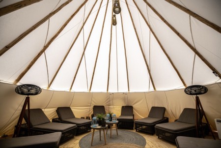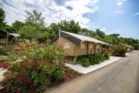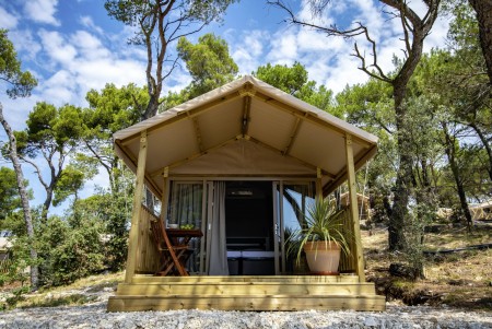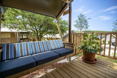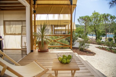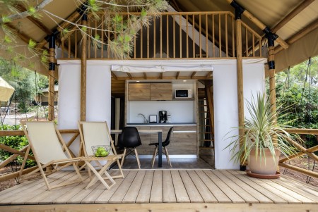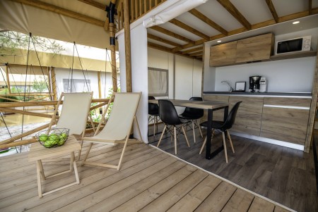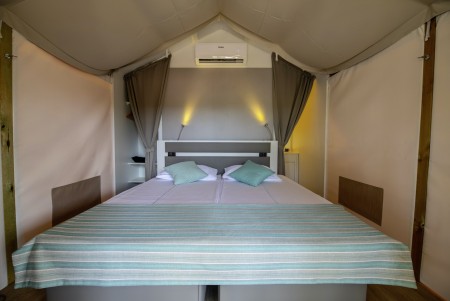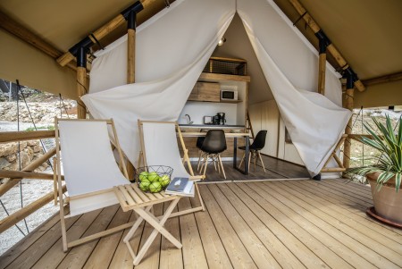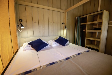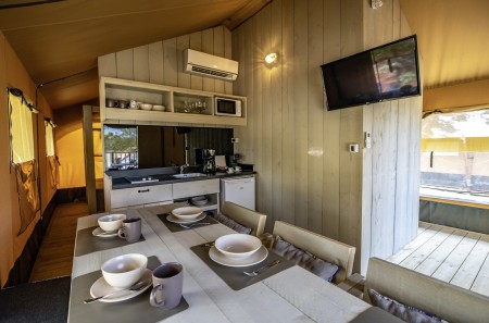 Tent for 4-6 people: approx. 35 m², one bedroom with double bed, one room with two bunk beds, bathroom with shower/WC and hairdryer, air conditioning, WiFi internet (free of charge), kitchenette with induction hob, microwave and fridge, coffee machine and ILLY espresso machine, LCD TV, safe and terrace (approx. 15 m²).