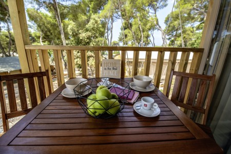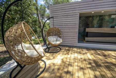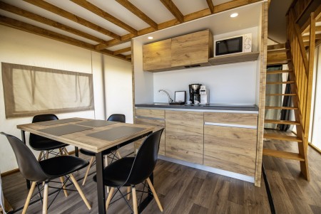 Mini-Lodge for 2 people: approx. 13 m², one double bed, bathroom with shower/WC and hairdryer, air conditioning, WiFi internet (free), mini fridge, kettle, coffee machine and ILLY espresso machine, LCD TV, safe and terrace (approx. 6 m²).