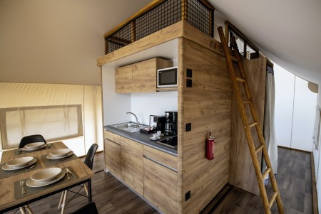 Safari tent for 2-4 people: approx. 22 m², one bedroom with double bed on the first floor, one double bed on the gallery (approx. 8 m²), one bathroom with shower/WC and hairdryer, air conditioning, WiFi internet (free of charge), kitchenette with induction hob, microwave and fridge, coffee machine and ILLY espresso machine, LCD TV, safe and terrace (approx. 8 m²).