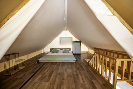 Safari Loft Tent Premium for 2-4 people: approx. 44 m², close to the beach, one bedroom with double bed on the first floor, sleeping area with double bed and terrace on the gallery (approx. 22 m²). One bathroom with shower/WC and hairdryer, air conditioning, WiFi internet (free of charge), kitchenette with induction hob, microwave and fridge, coffee machine and ILLY espresso machine, LCD TV, safe and terrace (approx. 8 m²) on the first floor.
