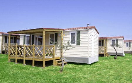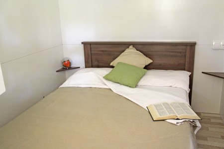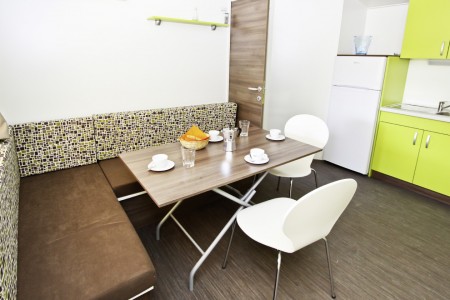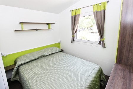 Mobile home for 4-5 persons "Premium": approx. 32 m², comfortably furnished, one bedroom with double bed (180x200 cm), one bedroom with two single beds (90x200 cm each), living room with kitchenette, dishwasher, microwave, kettle, safe, dining area and sleeping accommodation (corner bench 80x190 cm) for a child up to 11.99 years, two bathrooms with shower/WC, covered terrace (approx. 25.5 m²) with seating set and two sun loungers. Also WiFi Internet (free of charge), SAT-TV and air conditioning. Each mobile home has its own garden plot (approx. 170 m²). Each 8 mobile homes share a private swimming pool.