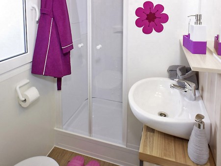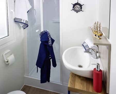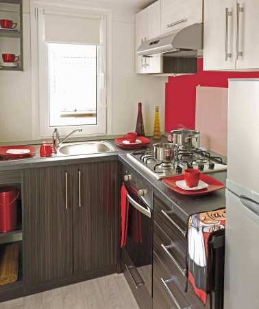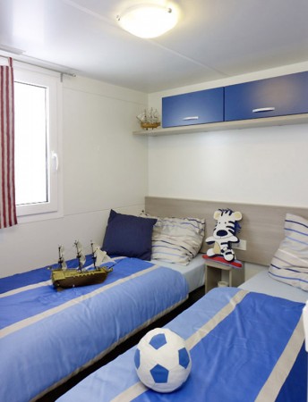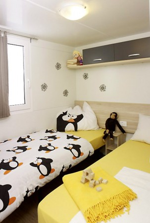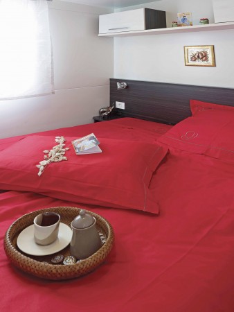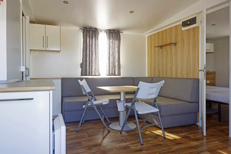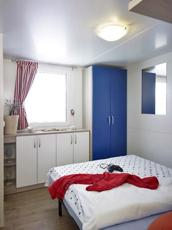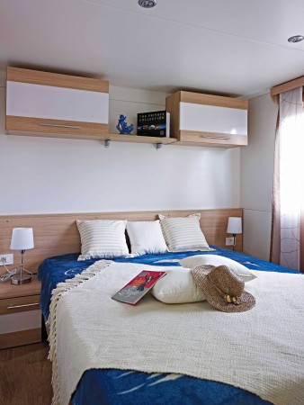 Mobile home "Lux" for 4-6 people: approx. 24 m², one bedroom with double bed, one bedroom with two single beds. Living room/bedroom with kitchenette (stove with 4 hotplates, fridge with freezer compartment, microwave, kettle) and a sleeping area for two people, a bathroom with shower/WC, covered terrace (approx. 11 m²) with seating. Also air conditioning and a parking space at the mobile home. No television.