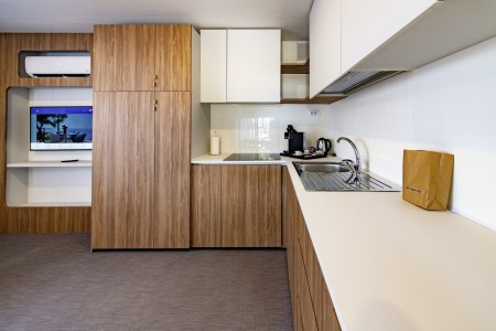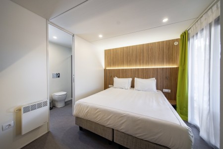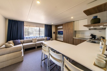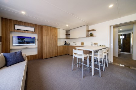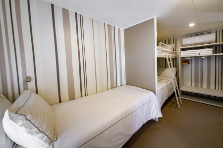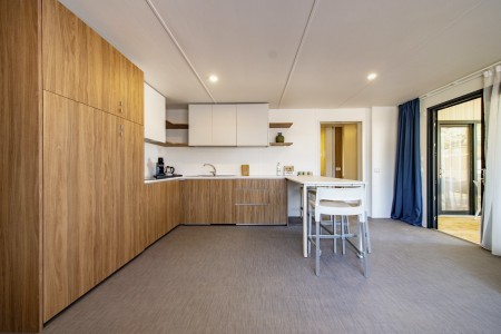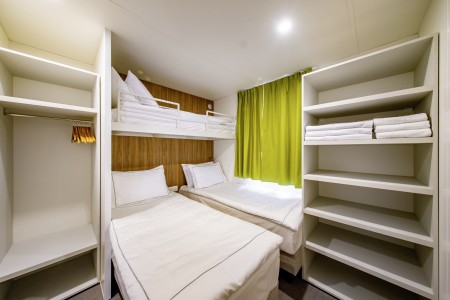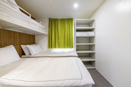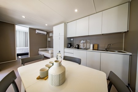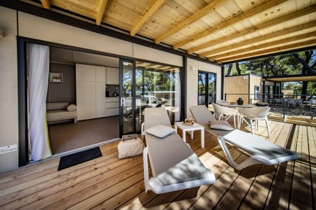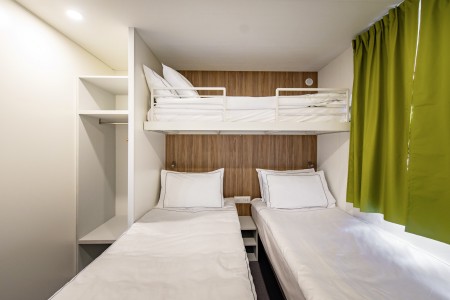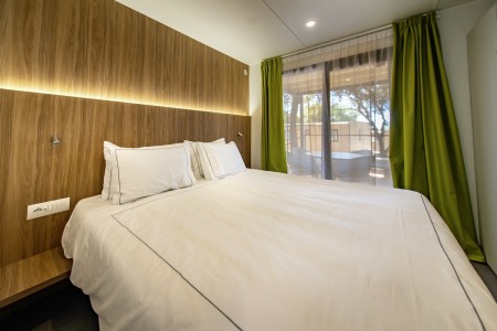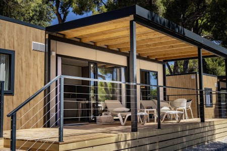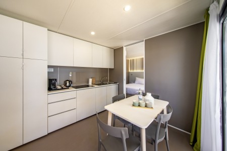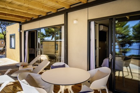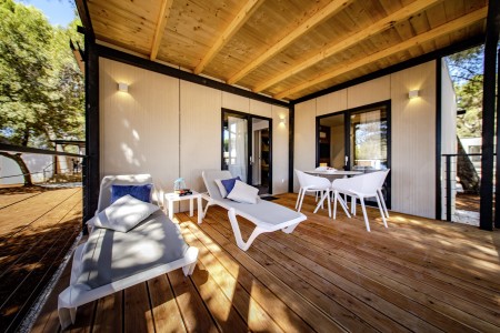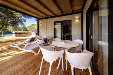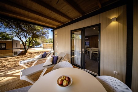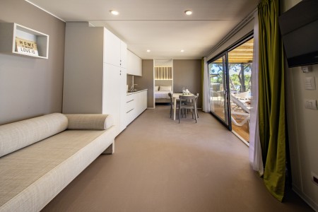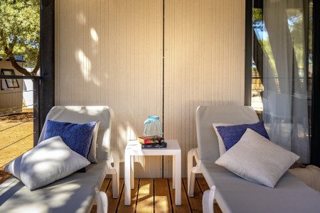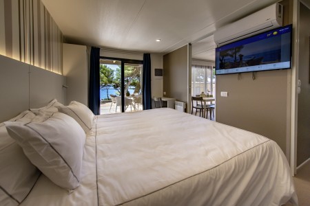 Camping villa for 4-5 people: approx. 46 m², one bedroom with double bed (180 x 200 cm), 43-inch Smart TV, private bathroom with shower, WC, hairdryer and toiletries. One bedroom with bunk beds (80 x 200 cm) or two single beds (80 x 200 cm) and en-suite bathroom with shower and WC Living room with sofa bed (80 x 185 cm) and Smart TV, electric radiators in the bathrooms and bedrooms, fully equipped kitchenette with fridge with freezer compartment, dishwasher, induction hob, microwave, kettle and Illy espresso machine, free WiFi internet, air conditioning, laptop-sized safe, partly covered terrace (29 m²) with sun loungers and seating area. Optionally bookable with panoramic sea view. Bed linen (changed every 4 days) and towels (changed every 2 days) included in the price.